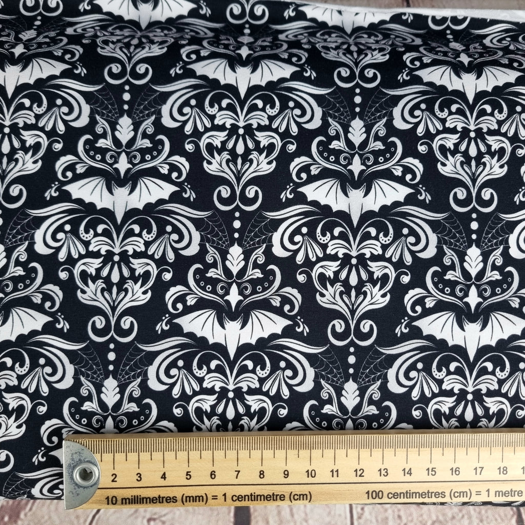 Damask bats cotton lycra jersey fabric. Great for leggings, t-shirts, lightweight hoodies, underwear and many more amazing crafts!