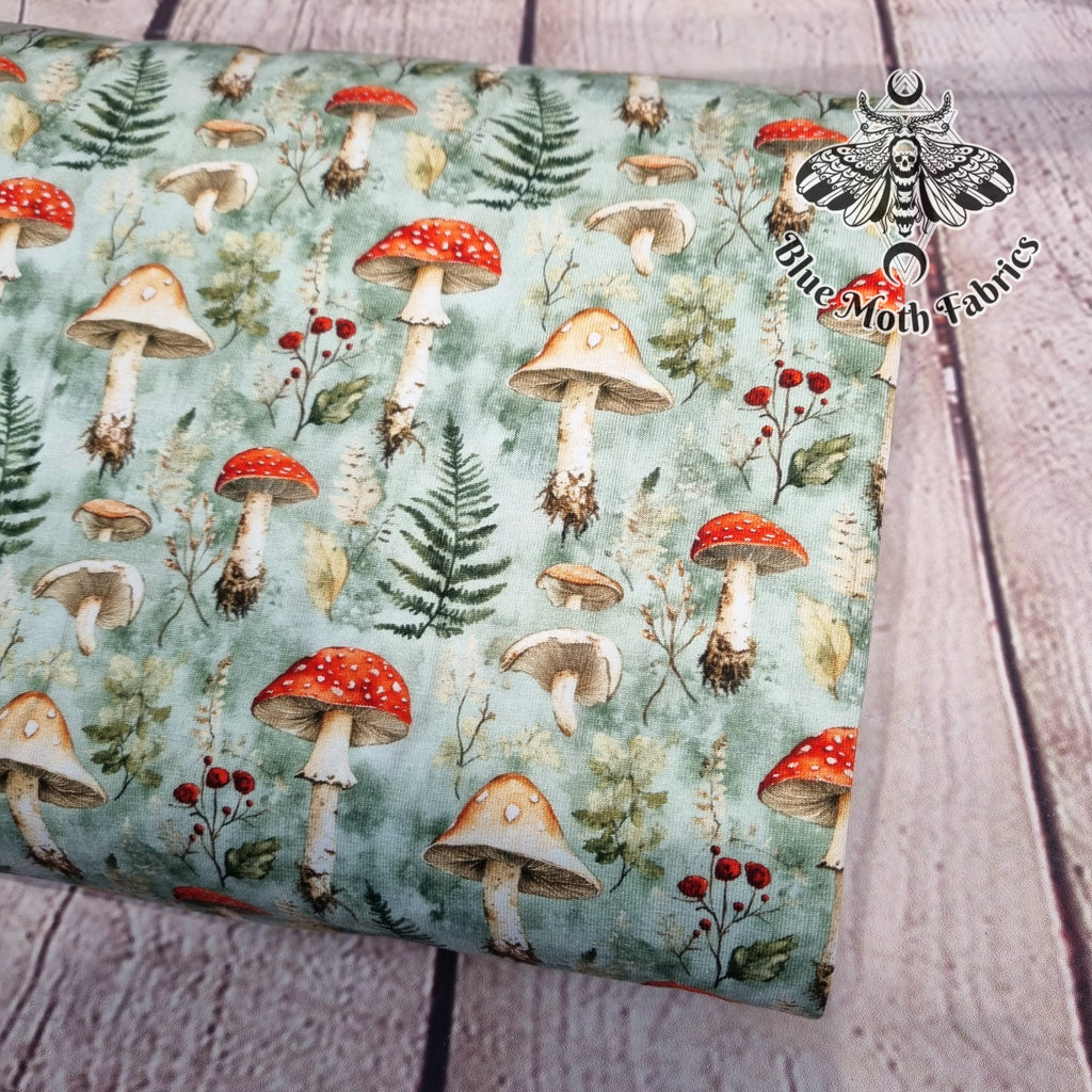 Mushroom nature cotton jersey fabric. This is a digitally printed cotton Jersey. With a Soft Hand and vibrant design. Perfect for making children's clothing, dressmaking, crafts, and homeware.