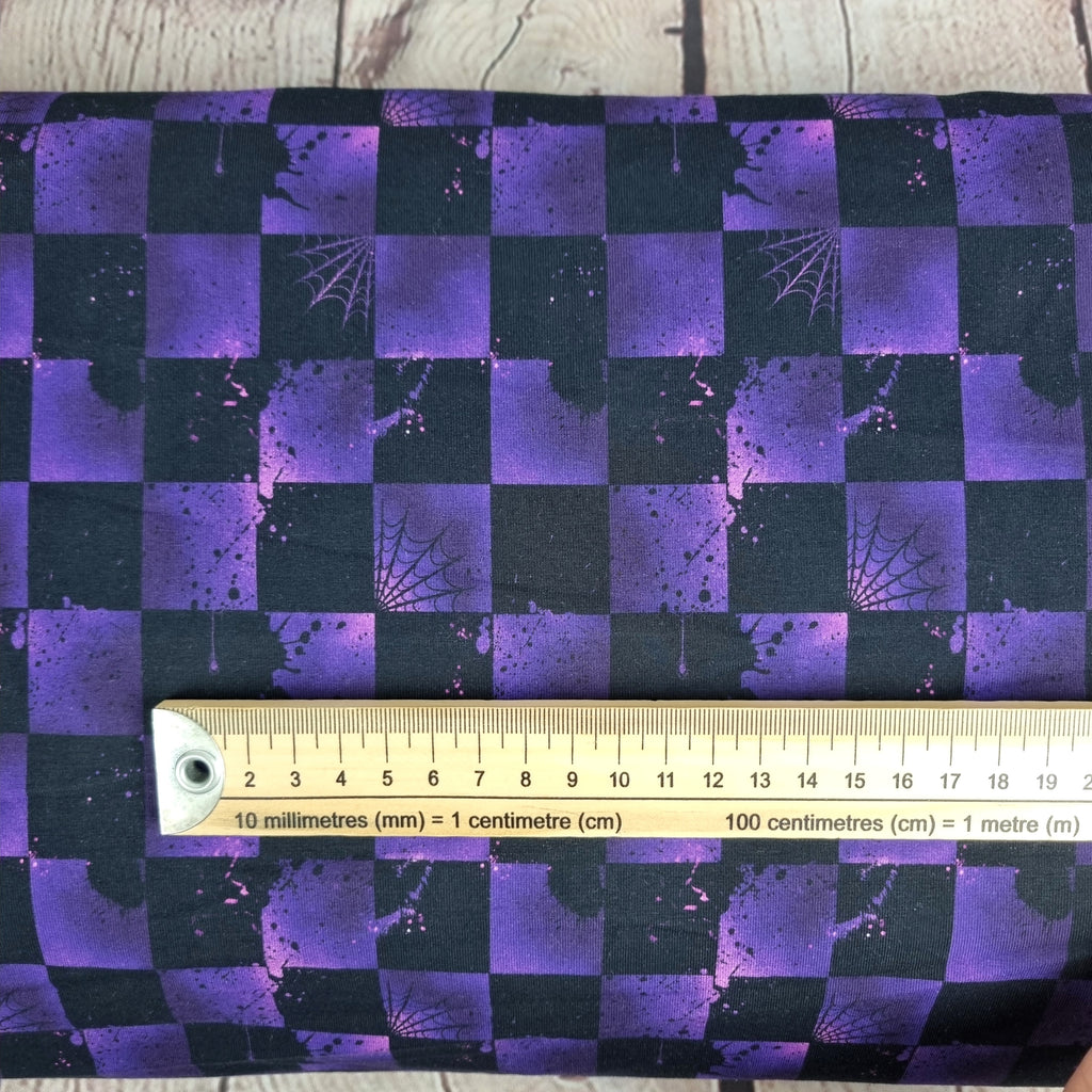 Purple spiderweb checkerboard cotton lycra jersey fabric. Great for leggings, t-shirts, lightweight hoodies, underwear and many more amazing crafts!