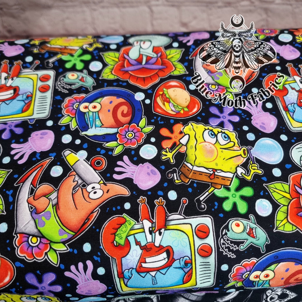 Sponge Bob cotton lycra jersey fabric. Great for leggings, t-shirts, lightweight hoodies, underwear and many more amazing crafts!