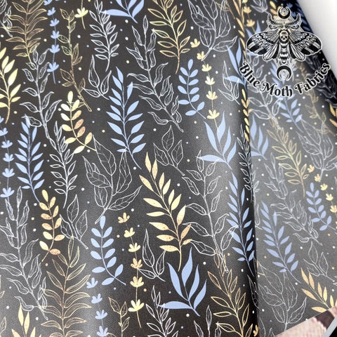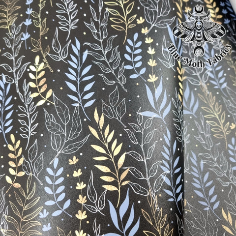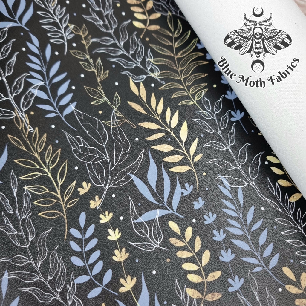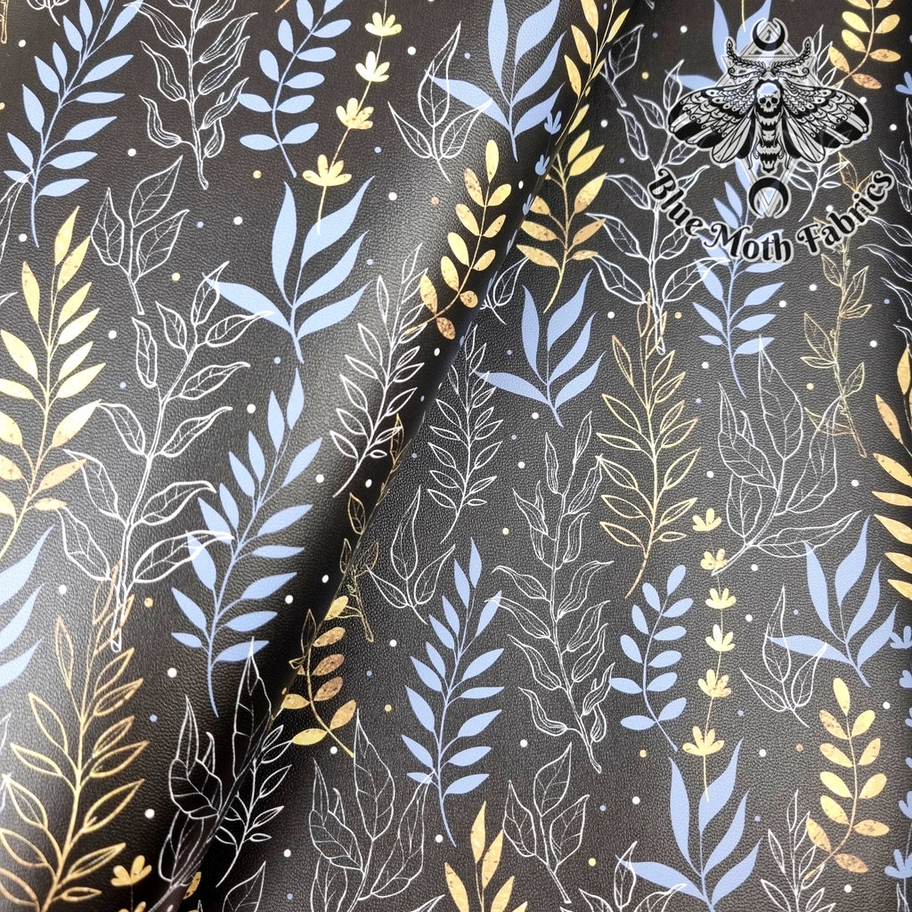 Gold and black minimal flowers Faux leather vinyl fabric. 39x66cm roll
