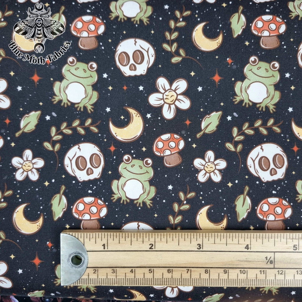 Spooky cottagecore frogs poplin cotton fabric. Custom-printed poplin cotton is a 100% cotton fabric. It is much smoother and more delicate than classic linen. It is perfect for dressmaking, crafts, bags, sewing bed linen, and textiles for sleep.
